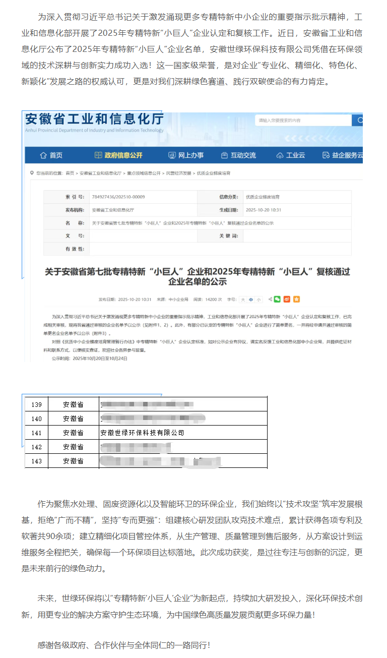 喜訊 | 世綠環保榮膺2025年國家級專精特新“小巨人”企業!